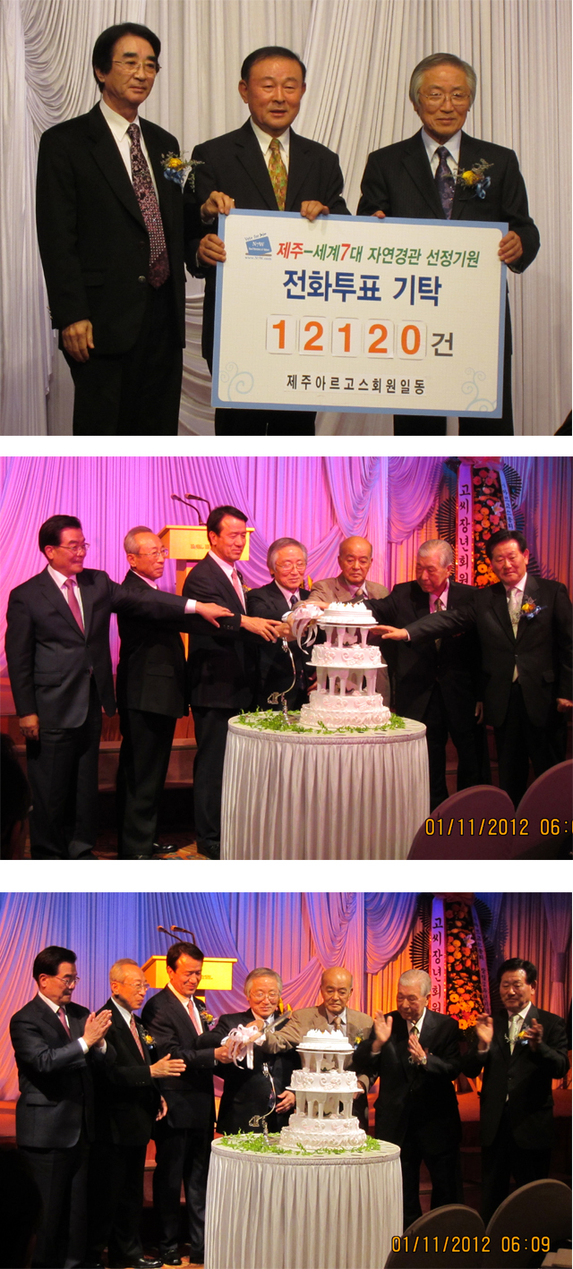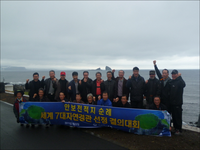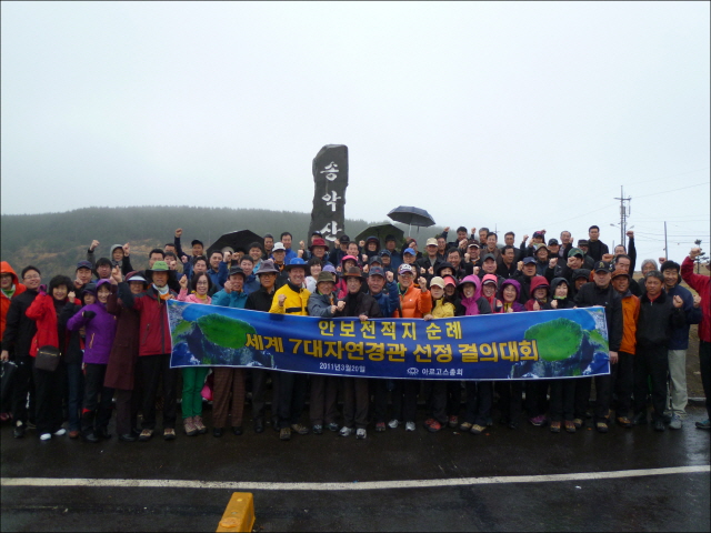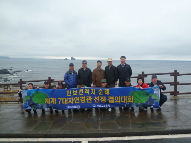 2011 3월 20일 안보전적지 순례 중 송학산 앞 "세계 7대자연경관 선정 결의대회"를 아르고스총회원 80여명이 동참하였습니다.